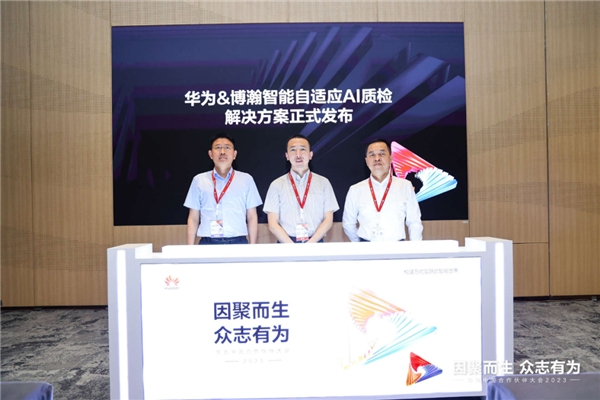 在本次论坛上,华为技术有限公司与博翰智能隆重发布了自适应AI质检解决方案。华为制造军团MKT与解决方案销售部部长徐建峰先生、博翰智能联合创始人&市场VP刘志伟先生、华为昇腾计算业务副总裁、昇腾推理解决方案总经理程龙飞先生参与了本次发布。