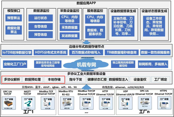 在端侧制造现场,中航机载共性基于通用数据协议的统一数据采集框架(协议库),构建了航空工业现场专用数据采集流程。IoTDB 兼容 OPC UA、ModBus、MQTT 等多类现场采集协议,并可稳定保持千万数据点秒级写入吞吐量,能够进行工厂侧数据全量、长时间本地缓存,并提供乱序、缺失数据预处理等功能。同时,中航机载共性研发了多种构形的数据采集套件,部署到位于南京、上海、西安的多个智能工厂中。IoTDB 应用于多类采集套件,帮助实现多协议数据解析及边缘层数据存储,处理结果可进一步支持健康监控、指令下发等下游功能。