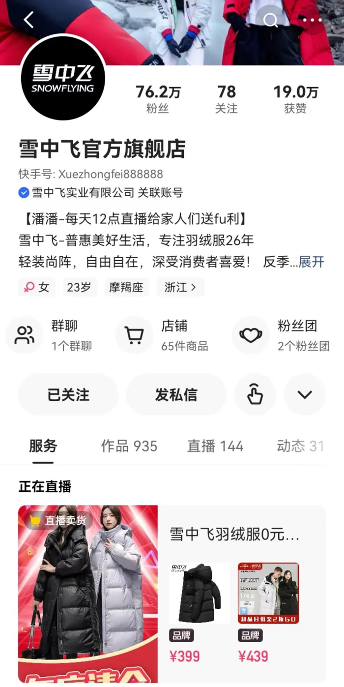 短短一年后,雪中飞重回市占率第二名的位置。2020 年,雪中飞启动“互联网+”运营模式,开始在线上发力。2021 年 10 月,雪中飞入驻快手,开播 3 个月销售额就突破 3000 万元,涨粉超过 40 万。