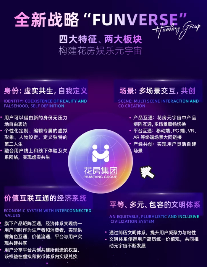 在花房集团的品牌文化中,用户需求永远被摆在第一位,由此形成了“讲真、求实、思变”的价值观,并以“用科技连接彼此,让陪伴传递美好”作为品牌使命。花房集团在上市当日发布的“娱乐元宇宙FUNVERSE”战略,正是为了满足用户需要的更加沉浸、更加智能的数字娱乐空间。