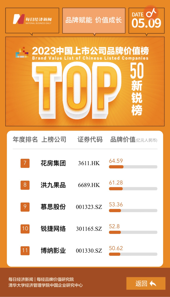 2023年5月9日,“2023中国上市公司品牌价值榜”正式发布。作为去年新晋的上市企业,花房集团凭借不断扩大的上市品牌影响力与持续提升的综合实力,首次登上中国上市公司品牌价值榜·新锐榜,并位居TOP7。