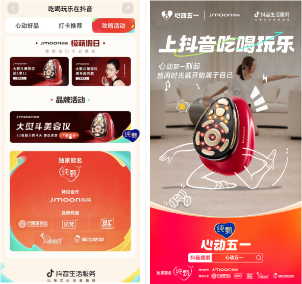 Jmoon极萌作为Ulike旗下全资子品牌,一经上市便迅速占领市场,特别是大熨斗美容仪,带来抗衰革新科技体验,得到众多消费者的青睐。此次作为特约合作伙伴参与「心动五一」,是因为Jmoon极萌期望进一步拓展的品牌目标人群,与「心动五一」的核心用户高度重叠。本次活动中,Jmoon极萌在抖音生活服务一系列高效营销工具、全新营销通路及流行互动玩法的帮助下,跑通超强圈粉路径,借势五一节点前后长周期渗透,更充分占领用户心智,在拓客赛道“弯道超车”。