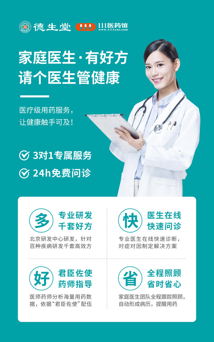 德生堂集团旗下“111互联网医院”,为顾客提供在线问诊及家庭医生服务。由私属家庭医生与专属医师、执业药师组成的3人健康团队,线上线下相结合,为顾客提供免费问诊、全科疾病咨询等一站式服务。