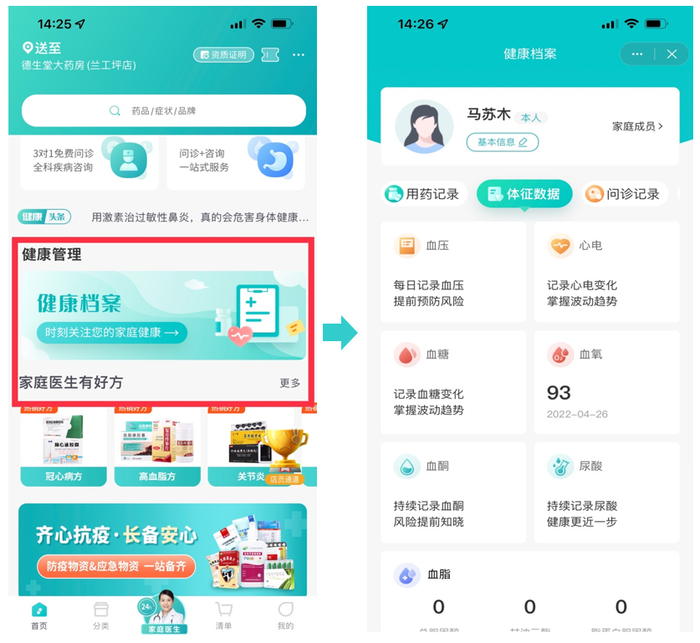 顾客在“德生堂连锁大药房”公众号及“111医药馆”APP可以很方便地查看自己的健康档案。
