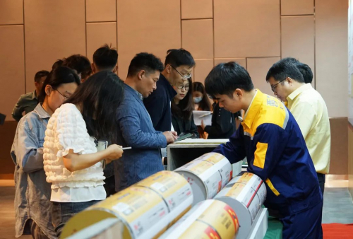 嘉宾们在会议现场展示区体验西牛皮防水产品