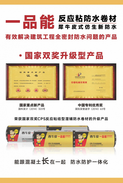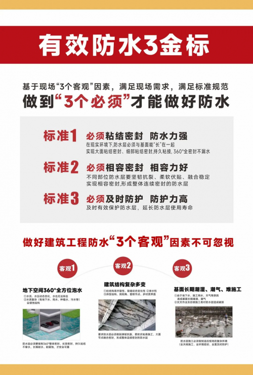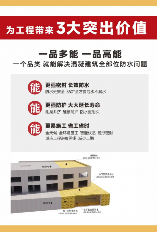 一品能三突破满足了有效防水3金标。与清华大学李广涛教授联合研发的一品能反应粘2.0技术,实现粘的突破,让防水层跟混凝士“长”在一起,能实现全天候施工,干也粘、湿也粘,实现整体、长效、密封防水。一品能韧的突破让防水层柔软伏贴、弹韧抗裂、相融粘结密封。一品能双反应粘界面防护技术实现刚的突破,让防水层与保护层刚柔结合,刚柔并济,一次成型,及时硬核防护,保护防水层更耐久。