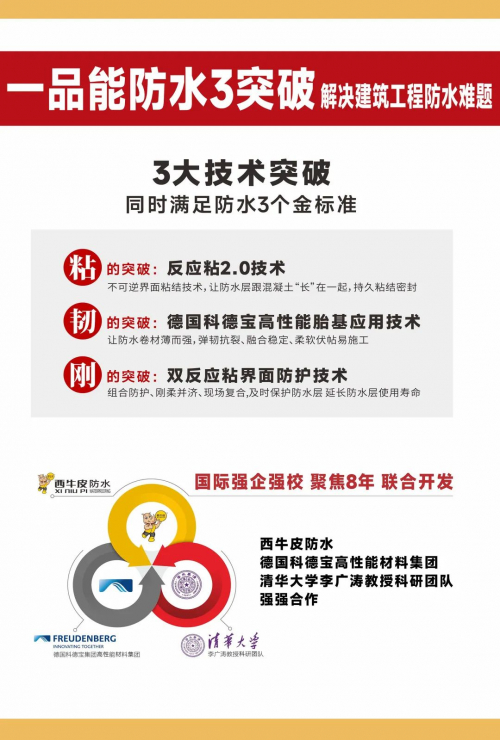 西牛皮是中国建筑防水行业唯二的“国家双示范企业”,是混凝土密封防水领域的科技创新排头兵。科德宝是一家拥有170多年历史的全球化技术集团,旗下的科德宝高性能材料集团是全球领先的创新技术制品制造商。清华大学教授、长江学者李广涛及其团队聚焦专注界面化学领域数十年,致力于用技术的创新与突破解决社会痛点,助力企业发展。共同的价值观与发展观让他们坚信,科技创新一定可以让建筑防水变的更好。三者强强联手,聚焦八年,靶向研发,在接连完成“粘、韧、刚”三大技术突破后,一品能防水防护一体化系列产品终是瓜熟蒂落,蓄势而发。