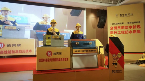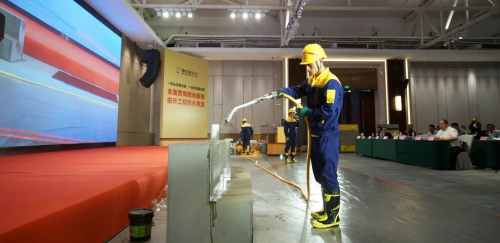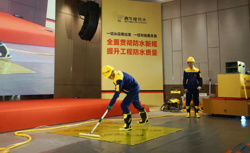 会议现场,西牛皮中队为大家展示了高品质防水施工演示,集现场化、机械化、军事化为一体的西牛皮中队,彻底解决了防水施工“干法乱、管理乱、验收乱”的顽疾,是通用规范实施,施工领域升级换代的必由之路。全国3000多个西牛皮中队,在济南,就在您的身边,随时随地为您服务。