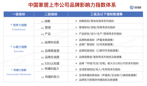 该指数以中国家居领域的上市公司为品牌主体,评估其在中国消费者群体中的心智认知、价值认同的综合指数模型,由竞争力指数、心智力指数和传播力指数构成。上榜的30家上市公司标杆品牌,包括:欧派家居、顾家家居、索菲亚、美凯龙、居然之家、喜临门、公牛集团、慕思股份、东方雨虹、志邦家居、金螳螂、东鹏控股、水星家纺、三棵树、欧普照明、好莱客、尚品宅配、箭牌家居、我乐家居、兔宝宝、金牌厨柜、富安娜、曲美家居、美克家居、蒙娜丽莎、惠达卫浴、北新建材、梦洁股份、大亚圣象、东易日盛。