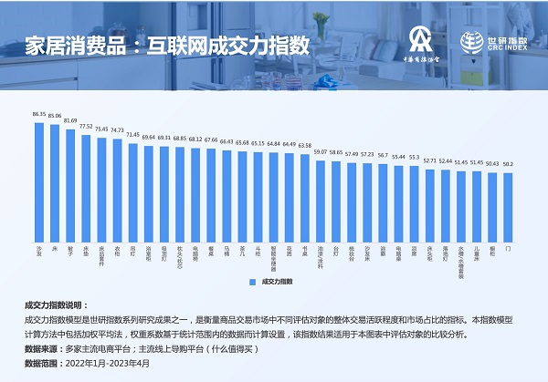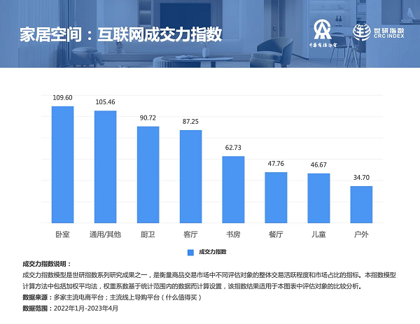 报告首次运用世研的成交力指数模型对家居多级商品品类、家居空间进行指数计算。成交力指数是衡量商品交易市场中不同评估对象的整体交易活跃程度和市场占比的指标,能够直观反映评估对象的消费热度。报告将各主流电商平台的家居商品的一级类目进行成交力指数计算,卧室家具和厨房卫浴分别是98.19分、93.7分,紧随其后的是客厅家具、床上用品、灯具灯饰,前5位的成交力指数较为集中。第二,在更细分颗粒度的消费品中,互联网上成交力指数领先的消费品是:沙发、床、被子、床垫、床品套件、衣柜、吊灯、浴室柜、吸顶灯、枕头枕芯。