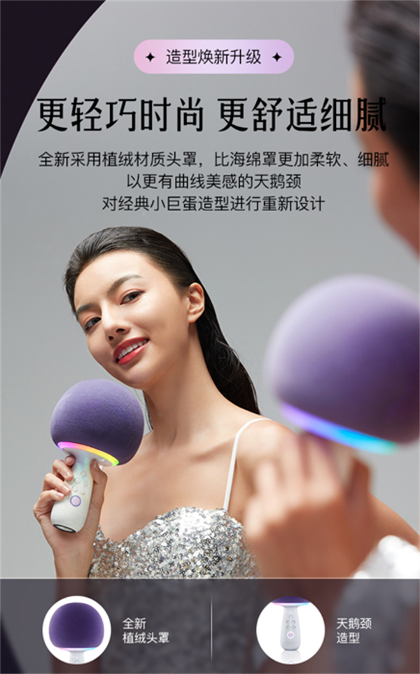 除此之外,对经典的小巨蛋造型也进行了重新设计:全新采用植绒材质头罩,相比以往的海绵罩,兼具防喷麦、保护作用的同时,更加柔软、细腻。手柄细节处也是大做文章,“巨头”与手柄连接处更加纤细,打造成更具曲线美感的天鹅颈造型。
