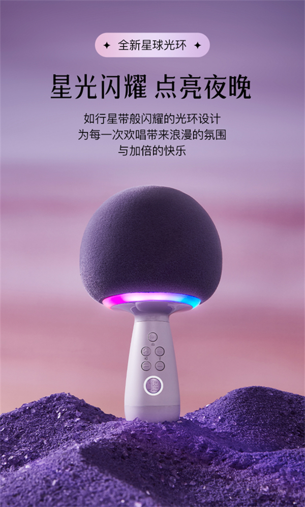 作为唱吧音箱麦克风的看家爆款--G2,此次迎来了它全新升级版本,麦克风、音箱、氛围灯功能三合一的全新产品。G2 504b的设计灵感与命名,源自“粉红星球”格利泽504b,是一颗外表呈粉紫色的年轻星球,象征着浪漫、青春、活力与纯粹。全新的星球光环系统,如行星带般闪耀,6种灯效交相辉映,为用户带来无与伦比的浪漫氛围。随着声音强弱改变,灯光也会随之变化,让用户在唱歌的同时,亲眼看到音符的律动。