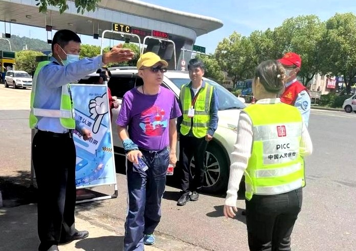 人保财险“温暖驿站”工作人员在高速出口处为出行车主提供帮助。