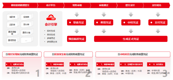 2、智能核算:通过会计引擎,将业务数据自动转换成财务凭证数据,满足多核算主体多维凭证,实时、自动生成。根据系统预设的标准灵活配置影响因素、参照科目对照表,多维设置凭证模板及入账科目,任意生成正式凭证,灵活的规则匹配财务核算不同的应用场景,同时通过智能财务核算引擎,将一张张报销数据转换成多个账簿的核算凭证,如内部往来凭证、主辅核算账簿、责任核算账簿等;