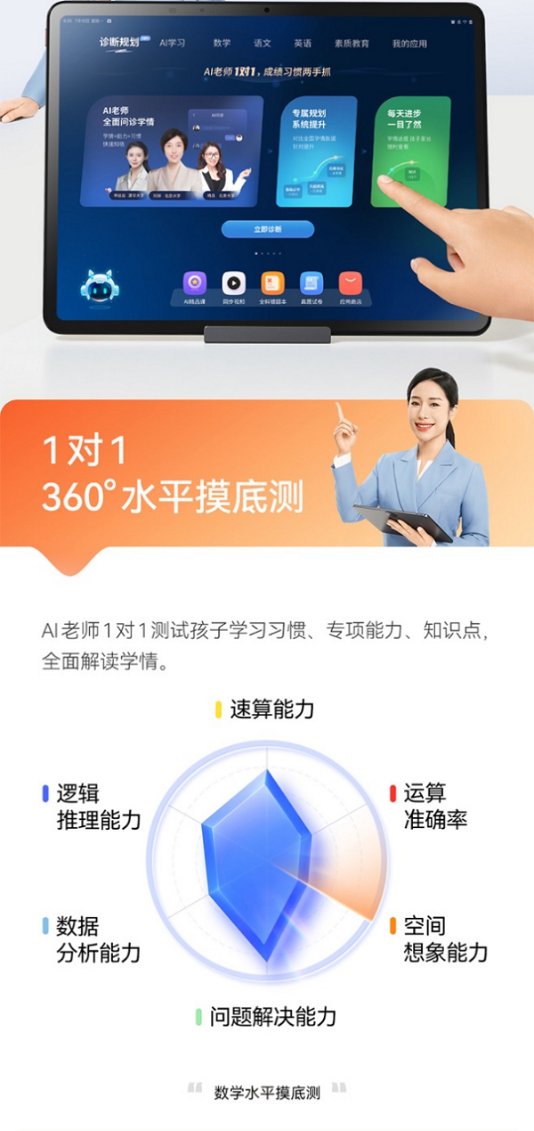 作业帮学习机则会事先对孩子进行摸底,围绕薄弱点、能力、习惯等方面进行360度全面测试,然后根据综合测试结果对孩子进行水平分层,生成专属课表并制定学习计划,通过后续在学习过程中不断对比差距、督促学习,让孩子高效地利用学习资源,帮助孩子养成良好学习习惯的同时,进一步提高孩子的学习效率。