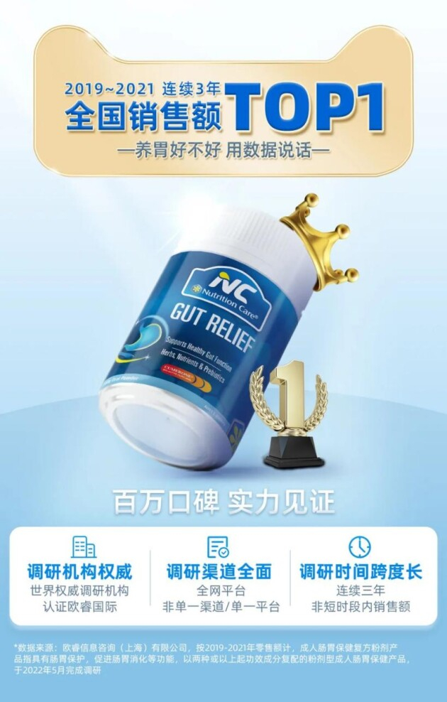 放眼国内,2016年Nutrition Care加入澳优集团后,一条高水平国际化的发展模式应运而生。2017年NC通过跨境电商进入中国市场,开创了跨境电商“养胃”细分品类,在市场不断开拓和良好的口碑效益加持下,NC养胃粉于2019-2021年连续三年获得肠胃保健复方粉剂全国销售额第一的殊荣,三年第一的荣誉也进一步夯实NC养胃粉在肠胃保健领域的行业领先地位。