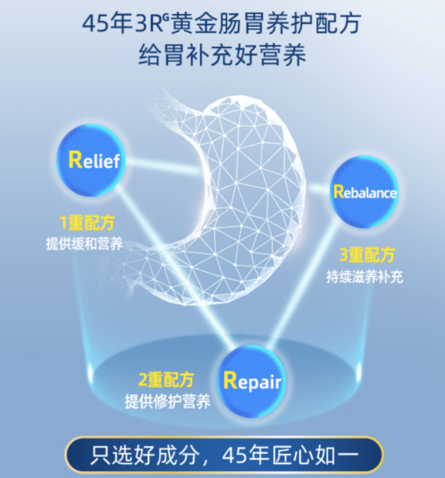 面对不断变化的健康行业市场环境,Nutrition Care一直坚持洞察用户需求,专注行业发展。基于产品创新和品牌价值升维,延续对国人肠胃健康的关注,坚持胃病“三分治,七分养”的核心观念,打造出比食疗更有效,比药物更安全的3RG黄金肠胃养护配方,希望通过改善肠胃健康,进而改善全身健康。