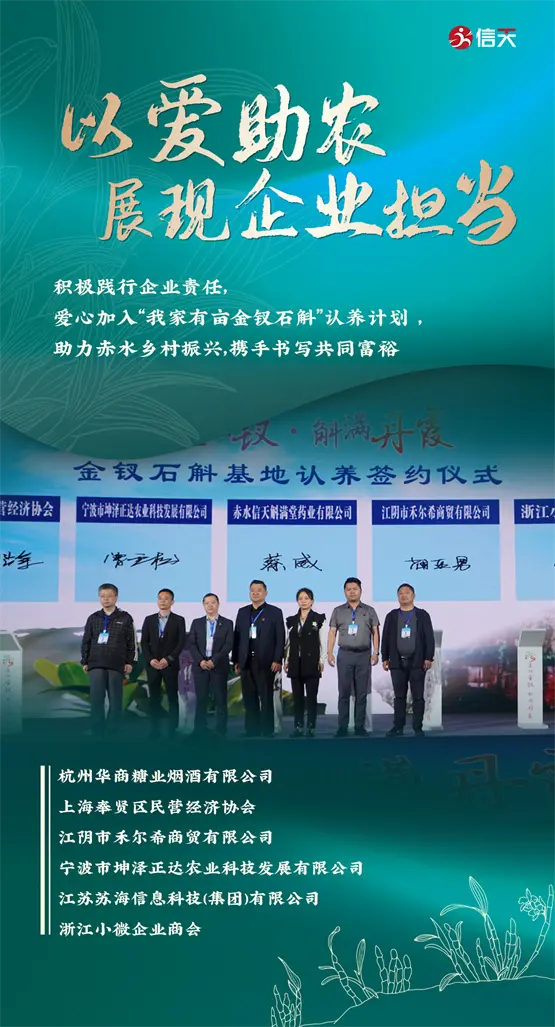 以信天为例,它采取“龙头企业+政府平台企业+村集体+农户”运作方式,打造了“我家有亩金钗石斛”的“认养计划”,助力赤水当地农户增收,得到了社会各界人士的认可与支持。在此次大会上,杭州华商糖业烟酒有限公司、上海奉贤区民营经济协会、江阴市禾尔希商贸有限公司、宁波市坤泽正达农业科技发展有限公司、江苏苏海信息科技(集团)有限公司、浙江小微企业商会等全国多家商协会、企业爱心认养金钗石斛,携手助农增收。