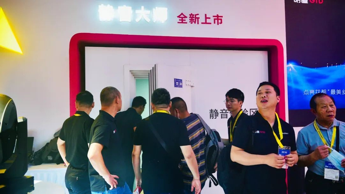 (展位现场,众多客户排队体验“静音大师”新品)