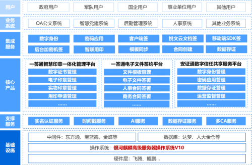 该方案依托银河麒麟操作系统及国产化主流软硬件产品基础设施为用户提供基于网信环境的底层支撑能力,在此基础上,安证通建立实名认证服务、时间戳服务、AI服务、数据存证服务、多CA服务等能力,可为各个业务系统提供智慧印章、电子签约、数字信任共享核心服务,确保各行业用户可在自主创新的环境下实现各个业务场景的印章管控、电子签章、电子签约、密码应用、身份认证等多种安全服务需求。