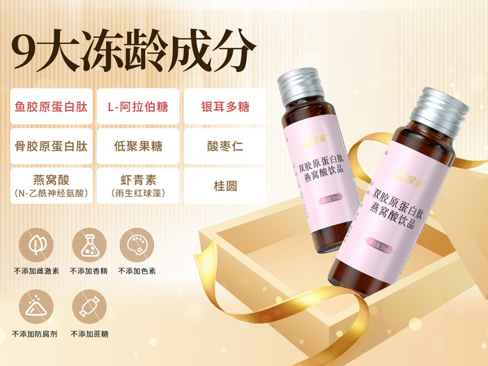 “健康多面手”配得上“生活多面手”——伟大的母亲群体。针对女性人群肌肤衰老及胶原蛋白流失的困境,国药控股星鲨制药(厦门)有限公司推出了星鲨阿唐TM双胶原蛋白肽燕窝酸饮品。该产品糅合9大冻龄成分:鱼胶原蛋白肽、骨胶原蛋白肽、燕窝酸(N-乙酰神经氨酸)、L-阿拉伯糖、低聚果糖、虾青素(雨生红球藻)、银耳多糖、酸枣仁、桂圆,小瓶浓缩,每瓶含有鱼胶原蛋白肽5000mg、骨胶原蛋白肽1500mg。