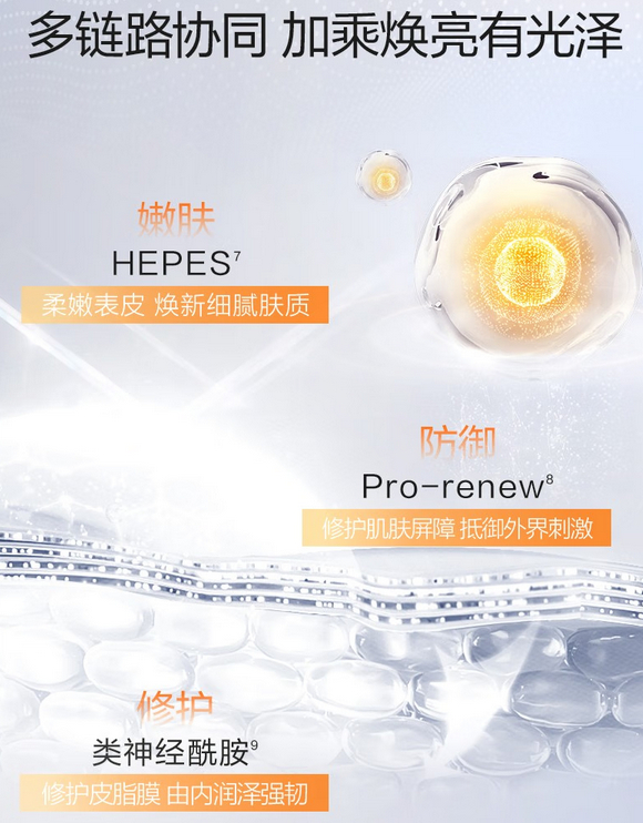 在珀莱雅双抗水乳组合焕亮系列中,含有多个产品,具有不同的强大功效,例如在双抗焕亮清透水中,就含有更轻柔温和的角质焕新成分HEPES,可以温和促进肌肤表皮层的老旧角质细胞剥落,能够温和嫩肤;而万金油式双向控油修护成分烟酰胺,则是能有效减少皮脂的形成和分泌,在一定程度降低粉刺的严重程度,做到外“控油”,同时通过促进角化细胞的分化,在维持角质层完整性的前提下细腻肌肤,完成内“修补”。当然,作为一款“水”,双抗焕亮清透水中还添加了能够稳筑肌肤水屏障的依克多因,可以快速聚合细胞间游离水分子形成水屏障保护层,维持细胞在缺水环境下的健康,有效提升肌肤水润度。