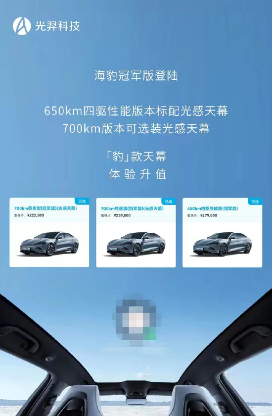 5月10日,比亚迪发布海豹冠军版。本次发布中,作为体验升值项的标杆,四驱性能版首次标配光感天幕,同时700km尊贵版和性能版可选装光感天幕。