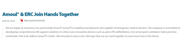 据悉,在今年11月份,在西班牙巴塞罗那的ERC年会上将选用安保的相关急救设备作为欧洲各支参赛队伍的标准考核培训设备。欧洲复苏委员会(ERC)表示:我们很高兴地宣布双方合作伙伴关系。安保医疗是一家领先的急救医疗设备制造商和供应商。该公司致力于开发重症监护领域的综合生命支持解决方案。自动心肺复苏、除颤器、重症监护室和转运呼吸机等创新设备有助于拯救世界各地的生命。