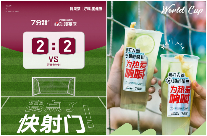 世界杯期间,7分甜联动抖音生活服务平台IP活动「心动观赛季」,结合观赛期间消费者“熬夜看球”、“情绪起伏”的洞察点,同时基于此前在抖音生活服务平台的成交数据经验,选品超柠茶,提炼养生人参、暴打等贴合消费者当下心态需求的产品可创新点,关联POI的“暴打人参超柠茶”一经上新,用户便主动发短视频分享。而及时的流量监测,也在官方短视频的内容投放中,被进一步扩大声量,让新产品一举成为世界杯期间的热卖单品。