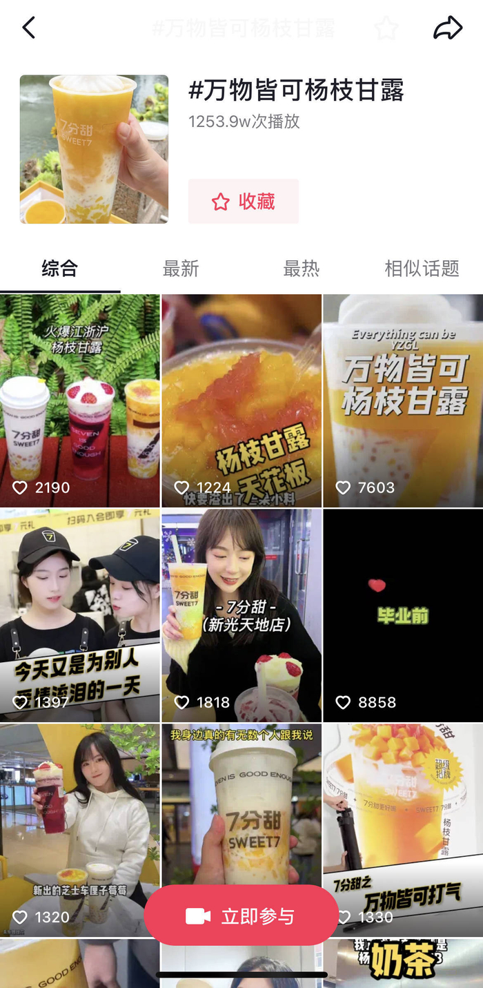 创新吸睛这条路上,7分甜从未停止过探索。从2006年7分甜前身的“谢记甜品”开始,杨枝甘露就是店内的招牌产品。7分甜入驻抖音后,继续在短视频内容中强化这款产品的品牌认知。以#万物皆可杨枝甘露# 玩法,将杨枝甘露经典饮品与小笼包式麻薯搭配,推出具有上海地域特色的“上海小笼包杨枝甘露”新品,与Oatly联名上新“燕麦奶杨枝甘露”,特别策划适合宝宝饮用的“mini杨枝甘露”单品,联名光明推出“杨枝甘露雪糕”等,通过限量版多样化杨枝甘露产品创新,让“杨枝甘露就喝7分甜”的品牌认知在不同阶段出现,持续在抖音强化“好玩产品”的心智,品牌差异化也更加明显。在这个流量与内容并重的时代,抖音生活服务既能提供巨量的曝光,提升用户对7分甜的认知频次,又能以原生用户力助推7分甜“差异化”内容的裂变传播。深耕平台玩法的7分甜,不断推出新品和平台绑定的吸睛内容,戳中平台传播痒点,撬动UGC内容的自发传播,而借助POI+内容挂售,平台链路可进一步激发消费者,在发现兴趣内容的同时,实现随心的消费闭环。