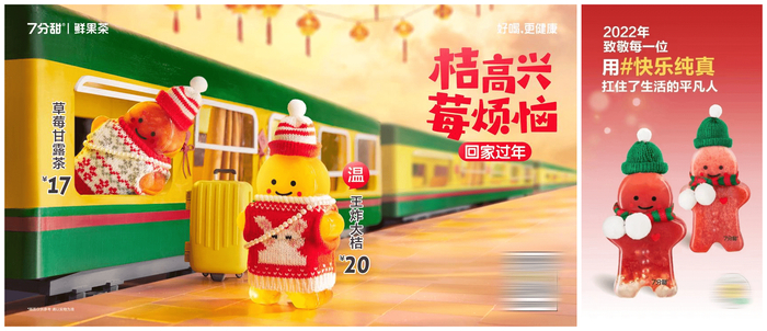 当然,这并不是7分甜仅有的出圈原因,除了内核的洞察吸睛,外包装的巧思设计和创新,也让7分甜的“姜饼人”成为当季新宠,人手一杯刷爆社交圈。浪漫圣诞,7分甜推出“姜饼人”包装茶饮,以“姜饼人”形象做成杯子,加入当季草莓等原料,搭配上圣诞氛围十足的帽子、围巾,将产品颜值拉满,一时间人们纷纷抢购“姜饼人”,引发尝鲜热潮,产品销量也登上“抖音茶饮单品销量榜”。在产品设计上打消费者觉得新奇的点,在众多新茶引推圣诞口味品的时候,7分甜另辟蹊径,把直接的吸睛“姜饼人”和产品包装做了结合,在众多风格相近的圣诞产品中,7分甜的特别产品自带流量属性,而结合抖音平台短视频玩法的产品热度传播,圣诞节期间,7分甜的姜饼人更是直接出现卖断货,自此,7分甜也走向了新创新经营高度。