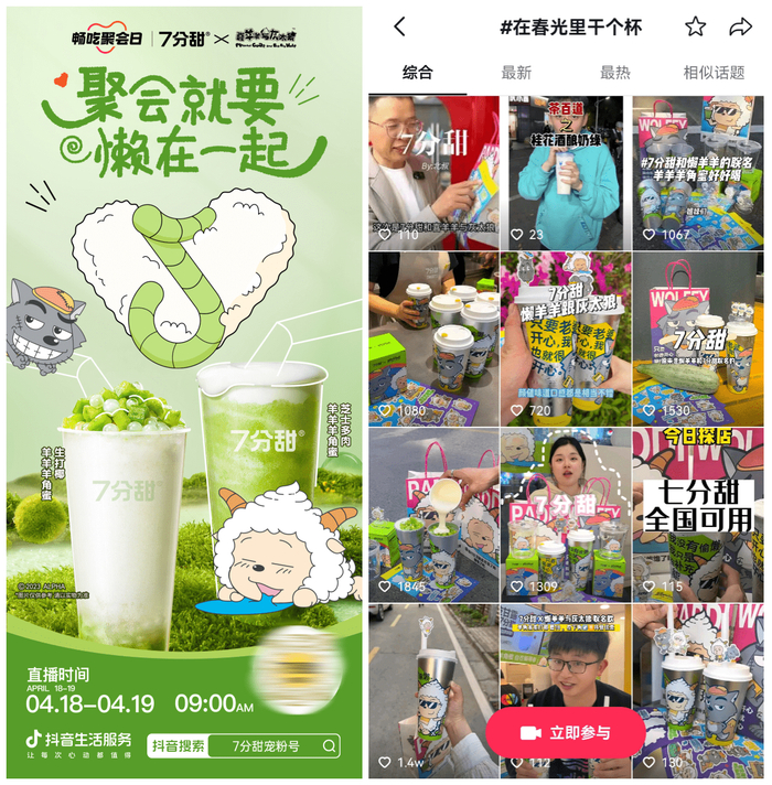 除了以月为维度进行创新,联动平台重点活动的产品上新也是一大亮点,诸如今年4月,正值“朋友出行”、“聚会场景”消费热潮,抖音生活服务「畅吃聚会日」平台IP活动的推出契合品牌宣推需求,7分甜抓住官方热点,提炼「畅吃聚会日」IP活动代表的“美好、快乐、自由”内核,联合“喜羊羊与灰太狼”经典动画IP,上线“羊羊羊角蜜生打椰”、“羊角蜜芝士多肉”春日新品。懒羊羊这一代表着自由生活态度的可爱卡通形象,在平台的用户群中具备强大的“爆梗”传播力,4月18日“聚会就要懒在一起”直播活动中,新品上线2天,便售出20万杯,直接刷爆“春日懒人圈”;而此前抖音生活服务「心动观赛季」平台IP活动期间的抖音专供热卖品,也为7分甜的线上购买加深了节点认知,配合平台玩法的持续上新品策略,在每月上新之际,7分甜官方同步推广新品短视频,并进行同城探店达人投放,根据投放内容测试新品在平台的爆火潜力,决定是否扩大规模投放或调整种草内容方向,以保证从产品到用户端的精准转化。