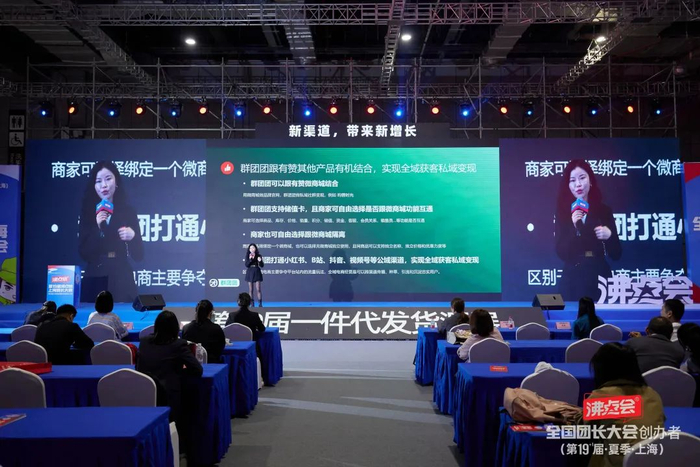 沸点的私域团长大会,共设一件代发货源展,私域团长趋势大会,沸点之夜资源对接晚宴,沸点群对接,以及面对面选品对接会等多个环节。