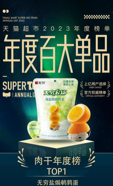 无穷农场系列为了让消费者吃到真正营养健康的鹌鹑蛋,斥资2.1亿元自建占地面积近400亩的绿色有机农场,无穷农场位于北纬23.8°,东经116.9°的凤凰山下,被茂密森林环抱,环境气候适合鹌鹑自然生长。无穷食品有限公司精选中华鹌鹑种苗,并用定制谷物饲料喂养。鹌鹑蛋从落窝到冷库再到成品,72小时内高效完成,新鲜安全可追溯。这样的“0药残”鹌鹑蛋经得起行业和消费者的长期考验。也正因如此,无穷鹌鹑蛋产品备受消费者青睐,无穷盐焗鹌鹑蛋还入选了天猫超市2023年度肉干榜TOP1。