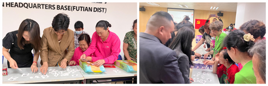 紧接着,主持人带领着大家开始进行刺激的“趣味拼拼乐”互动游戏环节。现场人员被分为AB两组,长辈们互相指导,配合默契,沉浸式体验游戏的乐趣,在团队的不懈努力下,一个个“字”呈现在眼前,大家开心地讨论着自己的“作品”,喜悦之情溢于言表。
