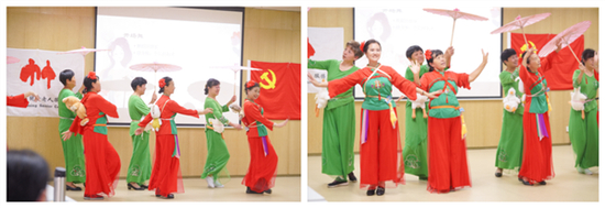 中产投慰问代表于5月12日14点到达筑梦关爱老人服务中心,为表达对中产投慰问代表的欢迎,筑梦关爱老人服务中心的老人们准备了热情的开场舞表演——《回娘家》。她们年龄在65-85岁之间,身穿鲜红的衣裳,两边腰上分别系着鸡鸭玩偶,背上背着一个洋娃娃,与民歌里的“左手一只鸡,右手一只鸭,身上还背着一个胖娃娃”相呼应。还原了女儿回娘家送礼、看望父母的生动场面,也体现了长辈们对生活的热爱。