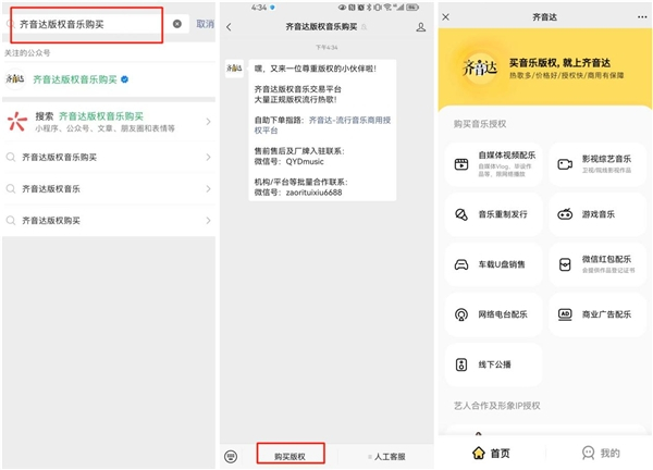 除了在购歌上为买家提供更多选择,齐音达还简化了购买流程,同时提供授权证书,保障买家的售后权益,让买家用得放心。个人、媒体及品牌用户只需关注【齐音达版权音乐购买】微信公众账号,点击下方菜单栏的【购买版权】,即可进行选歌及版权购买。齐音达的授权流程简便,线上即可完成一站式选购,节省了买家的时间成本。当买家在齐音达平台上购买商用音乐后,即可获取歌曲的授权证书。该授权证书由歌曲版权方直接出具,买家可前往齐音达的订单页查看并下载。