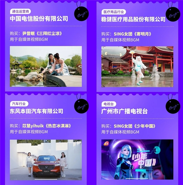 比如,中国电信股份有限公司、稳健医疗用品股份有限公司、东风本田汽车有限公司、广州广播电视台等企业主及主流媒体,在制作品牌自媒体视频中,就购入了来自齐音达的正版音乐授权。他们分别以尹昔眠演唱的《三拜红尘凉》、SING女团演唱的《寄明月》、yihuik苡慧演唱的《热恋冰淇淋》以及SING女团演唱的《少年中国》等热门流行音乐作为BGM创作出优质的内容,为品牌宣传锦上添花。
