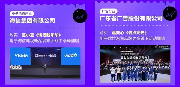 当然了,优质的音乐还可以为企业的各类线下策划活动中营造气氛。海信集团有限公司在齐音达平台购买了《诗酒趁年华》,用于海信电视新品发布会现场翻唱;广东省广告股份有限公司为欧拉汽车策划的品牌之夜活动上,则购买了《去点亮光》,作为现场暖心合唱环节的曲目。