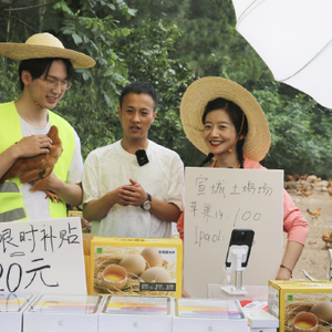 学家优品主播老皮(左)、橙橙(右)与堆草堆负责人戴文祥(中)一起发布土鸡蛋