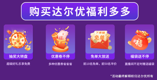 6.18达尔优各店铺也有福利放送,优惠多多。抽奖大转盘,超级好礼乐享免费。优惠券不停,多种优惠券省省省。此外还有免单、半价、福袋等多种玩法,让你增加购物的乐趣。