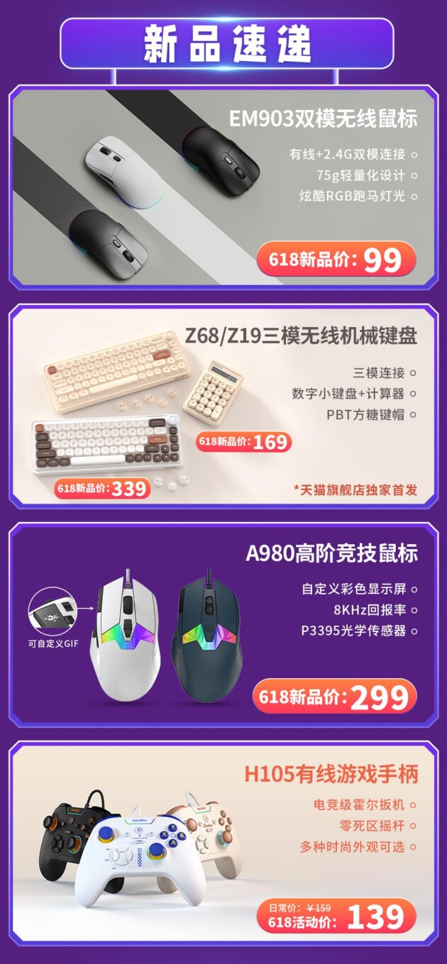 6.18从来不缺少新品,达尔优在本次6.18也推出了不少新品。可同时驾驭游戏与办公的EM903双模无线鼠标只需99元,专为游戏打造的售价299元的达尔优A980高阶竞技鼠标就是游戏党的福音。玩游戏更带劲的H105有线游戏手柄到手价只需139元。颇具创意的小方糖Z68+Z19三模无线机械键盘既是理想的办公助手又是送礼佳品。