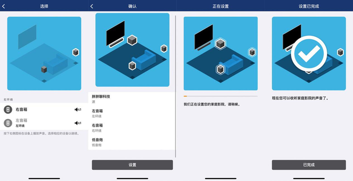 随后,我们需要设置2个环绕音箱的定位,分别点击两个环绕音箱的喇叭图标,就可以分出左右音箱了。最后,确认一切设置无误,就可以等待系统自动设置完成了。