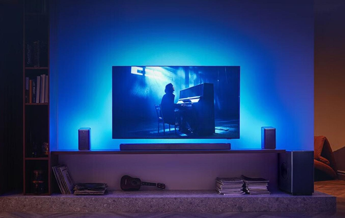 此外,FS1背面还搭载了8颗LED灯,能够带来更具氛围感的环景光,提供三种氛围灯模式,为你的日常观影增加更强的沉浸感。当然如果你家的电视刚好是飞利浦环景光电视搭配,那将更加完美,效果大致如下图: