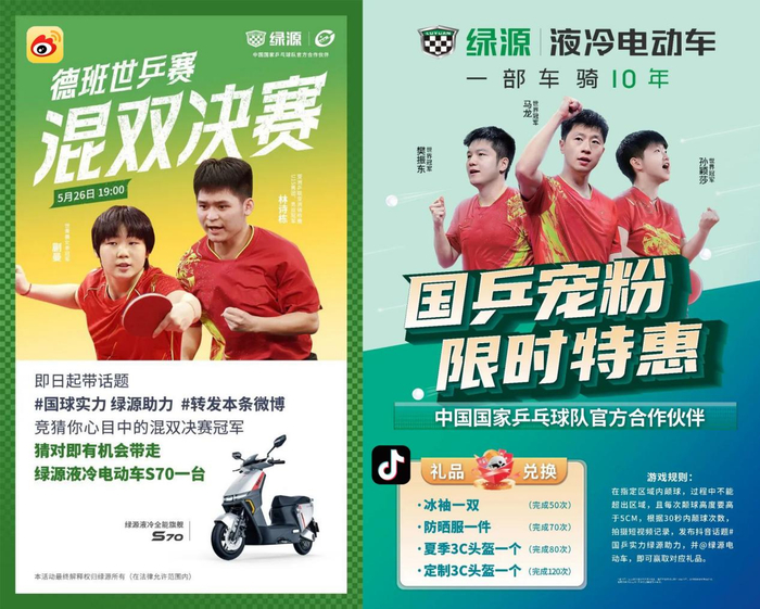 据了解,为应援国乒队征战德班,绿源在全国线上线下同步展开多元化营销活动,鼓舞粉丝观战热情。5月25日~28日决赛期间,在绿源电动车在微博发起带话题#国球实力绿源助力#关注、转发说出你认为的冠军归属,即可有机会获得S70液冷电动车的活动。同时也在抖音发起趣味挑战赛活动,用户在绿源线下门店内,发布用乒乓球拍颠球的小视频,凭借垫球数量可获得相应购车减免优惠和丰厚礼品。
