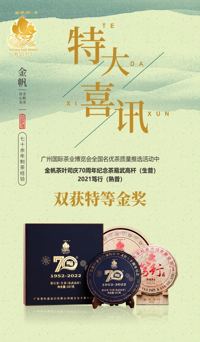 经过71年的发展,金帆犹如一艘远航的巨轮,伴随着大量优质茶叶的行销,走遍了世界。在祖国大地,在日本,在东南亚,在港澳地区,在欧美,赢得了众多新老客户的赞誉,行销世界100多个国家与地区,在国内外质量大赛评比中屡获特等金奖、金奖,品质优异,全球认可。也在众多国内外客户的心目中成了品质优良、有收藏价值的陈年普洱代名词。斩获国家二级企业,中国茶业百强企业,广东省著名商标,广东省名牌产品、广东省重点培育和发展品牌、广东老字号、广州老字号、广州十大手信生产企业,广东省重点商标保护名录品牌等几百项荣誉称号,在荷兰、澳大利亚和智利等国家已成为中国茶品牌的先锋品牌。