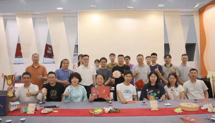 茶叙会开始,金帆茶叶营销部总经理李镇涛发表了热情洋溢的讲话,深深鼓舞着在场的经销商们。他还公布了一个特大喜讯:金帆茶叶70周年纪念茶易武高杆生普、2021年笃行熟茶今天双双获得广州茶博会全国名优茶质量推选活动特等金奖,引来场上雷鸣般的掌声。