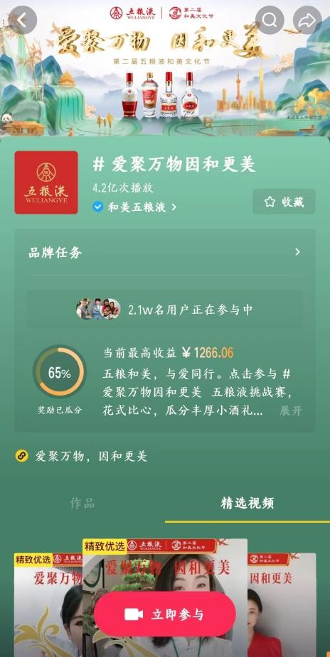 近日,随着第二届五粮液和美文化节的深入开展,五粮液“#爱聚万物因和更美”抖音挑战赛热度再次创下新高。目前,在抖音搜索该活动,显示已有2.1万余名用户参与创作,相关视频播放量达到4.2亿次,活动将持续至5月31日。