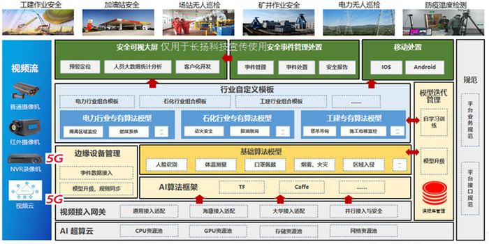 在某石化项目中,长扬科技生产安全需求,提供视频智能AI分析解决方案。实现对9大类,34个视觉AI算法模型训练与优化。对现场的人机料法环进行实时监测,提升整网生产系统的安全等级,保障安全生产,最终减少因安全事故造成的经济损失和社会影响。这一解决方案目前已经应用在全国电力、石油化工、煤矿、粮库、军工、制造等多个行业及客户。