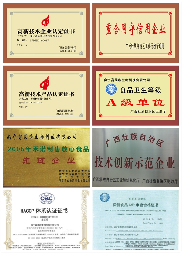 同时富莱欣还是广西首批“保健食品质量授权人”试点单位、卫生厅“食品卫生等级A级”单位、广西首批拥有保健食品出口资质单位、“安全生产标准化企业”、“人才小高地示范单位”等等。先后被认定为“国家知识产权优势企业”、“广西自治区技术创新示范企业”、“广西战略性新兴产业企业”、“广西自治区认定企业技术中心”、“自治区产学研用一体化企业”、“广西创新型试点企业”、“自治区知识产权优势培育企业”、“南宁市高层次创业创新人才(团队)”。通过《企业知识产权管理规范》(GB/T 29490)、HACCP体系认证。